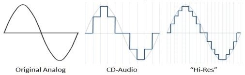 그러나, 음질 측면에서는 몇 가지 주목할 점이 있습니다. 디지털 음원의 품질은 비트 심도(bit depth)와 샘플링 레이트(sampling rate)로 결정됩니다. 도해를 보면, Y축의 촘촘한 정도가 비트 심도를, X축의 촘촘한 정도가 샘플링 레이트를 나타냅니다. 아날로그 신호가 가장 자연스러운 곡선을 그리는 반면, CD 음질(16bit/44.1kHz)은 이보다 덜 섬세하고, Hi-Res(32bit/384kHz)는 아날로그에 가까운 부드러운 곡선을 만들어냅니다. 쉽게 말해, 비트 심도는 소리의 다이나믹 레인지를, 샘플링 레이트는 표현 가능한 주파수 범위를 결정합니다.