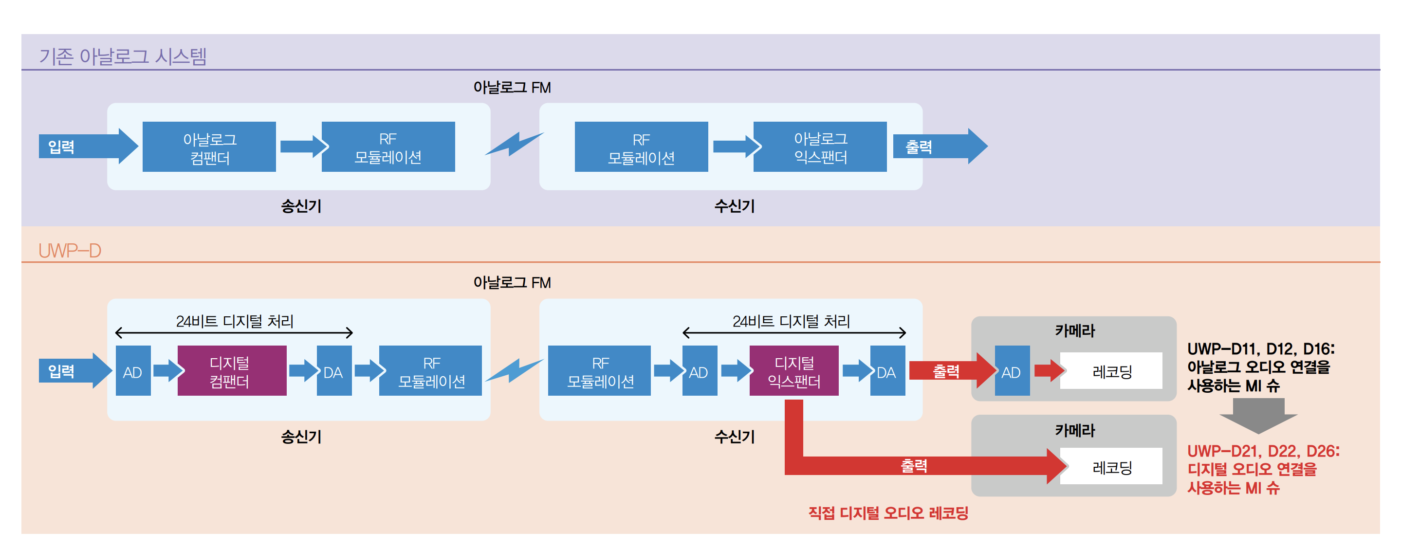*반면, 전문가형 DWX 시리즈는 WiDIF™-HP 코덱으로 24bit/48kHz의 순수 디지털 처리를 하며 20Hz-22kHz의 더 넓은 주파수 범위를 지원합니다. 그러나 UWP-D 시스템은 925-937MHz 대역의 UHF 방식을 채택하여 2.4GHz 대역의 시스템보다 안정적인 신호 전송을 보장한다고 알려져 있습니다.