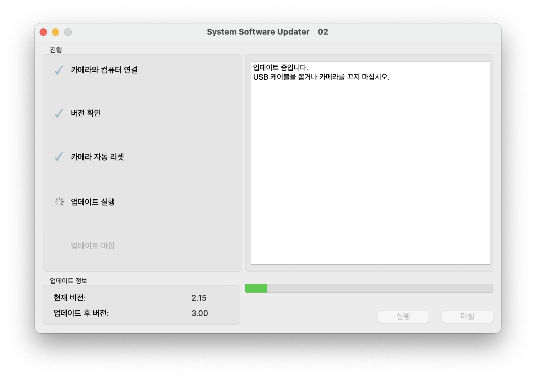 버전 2.11 이하의 경우, 먼저 업데이트 프로그램 01_Update_ILCE7SM3V215.app을 사용하여 중간 버전을 경유하여 업데이트해야하며, 버전 2.15 이상인 경우 업데이트 프로그램 02_Update_ILCE7SM3V300.app을 사용하여 버전 3.00(으)로 업데이트합니다.