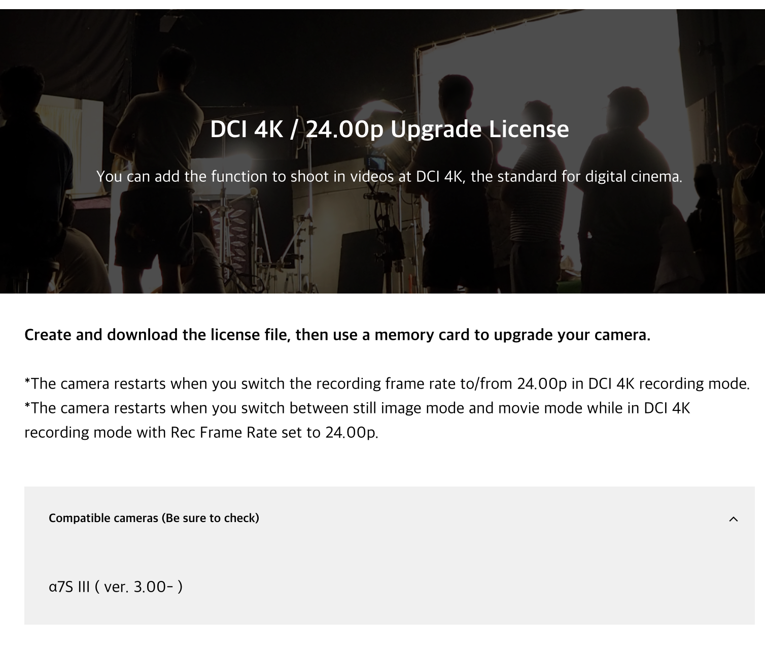 디지털 시네마 표준규격인 DCI 4K 24.00p 라이선스가 펌웨어 버전 3.00을 실행하는 α7S III을 위해 무료로 공개된 바 있습니다. 이를 통해 소니 A7S3는 과거 4K(QFHD: 3840×2160)보다 더 넓은 4096×2160 해상도로 비디오를 녹화하고 24.00p의 프레임 속도를 선택할 수 있게되었습니다. 라이선스 파일을 메모리 카드에 담아 카메라에 설치하는 방식으로 이용하며 한번 설치하면 무제한 기간 동안 사용할 수 있습니다.