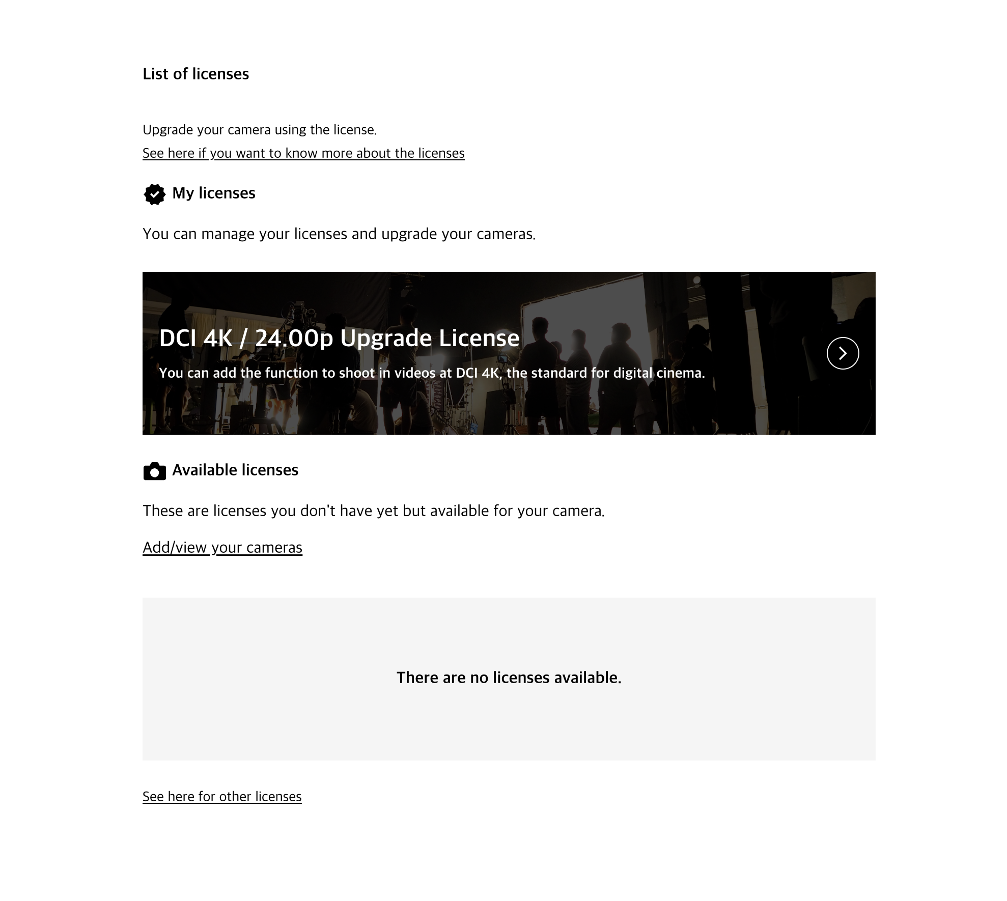 - 카메라의 MENU [Setup]>[Setup Option]>[Manage Licenses]를 열고 획득한 라이센스 이름이 있는지 확인합니다.